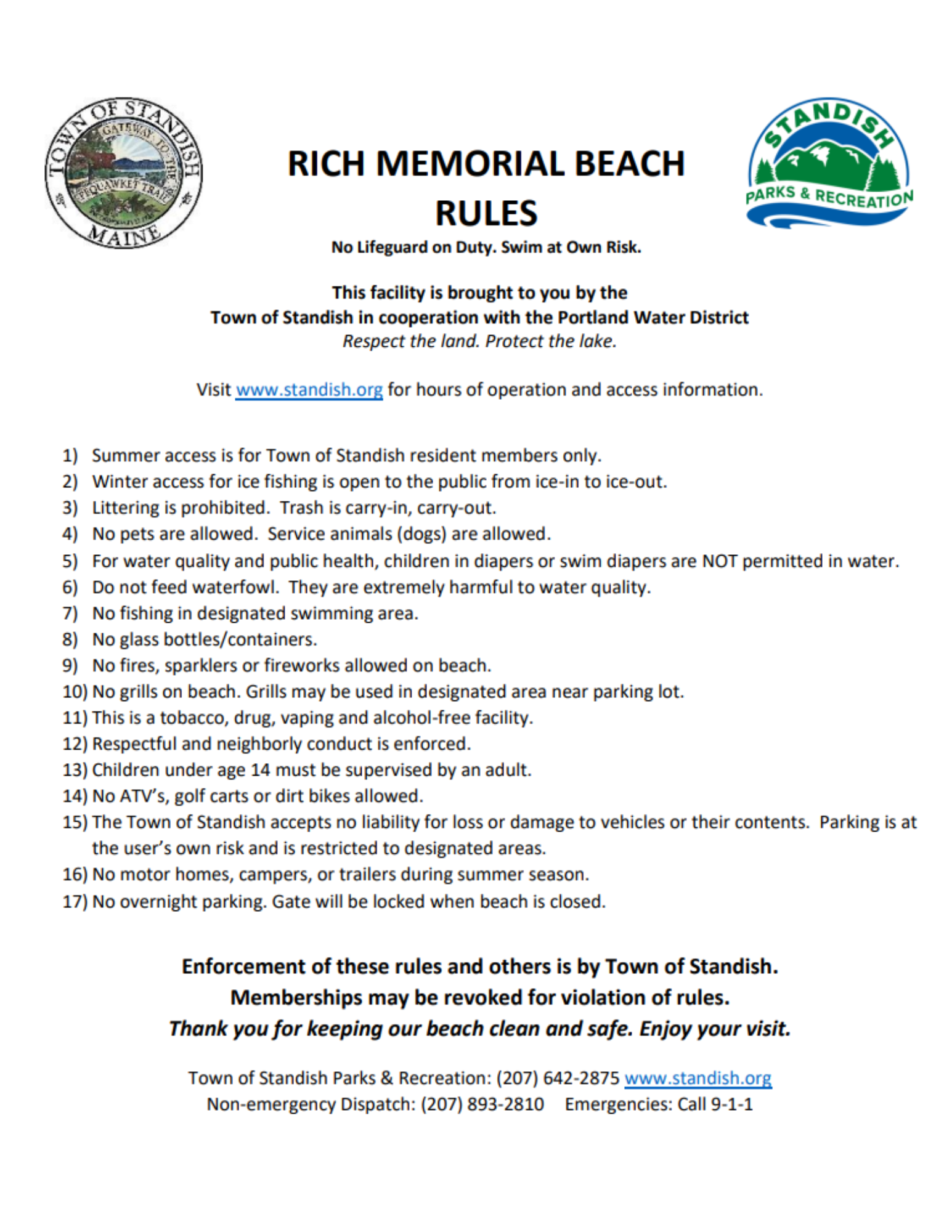 In cooperation with the Portland Water District and the Town of Standish, this municipal facility offers a beautiful sandy beach, picnic area and lots of parking. Access is available to Standish/Steep Falls residents and business owners only who have purchased a seasonal beach membership. In addition to the summer months from Memorial Day - Labor Day, we offer some fall and winter access. Launch a kayak and take advantage of the beautiful fall foliage or in the winter ice fishing access and parking is available. Check the schedule below.